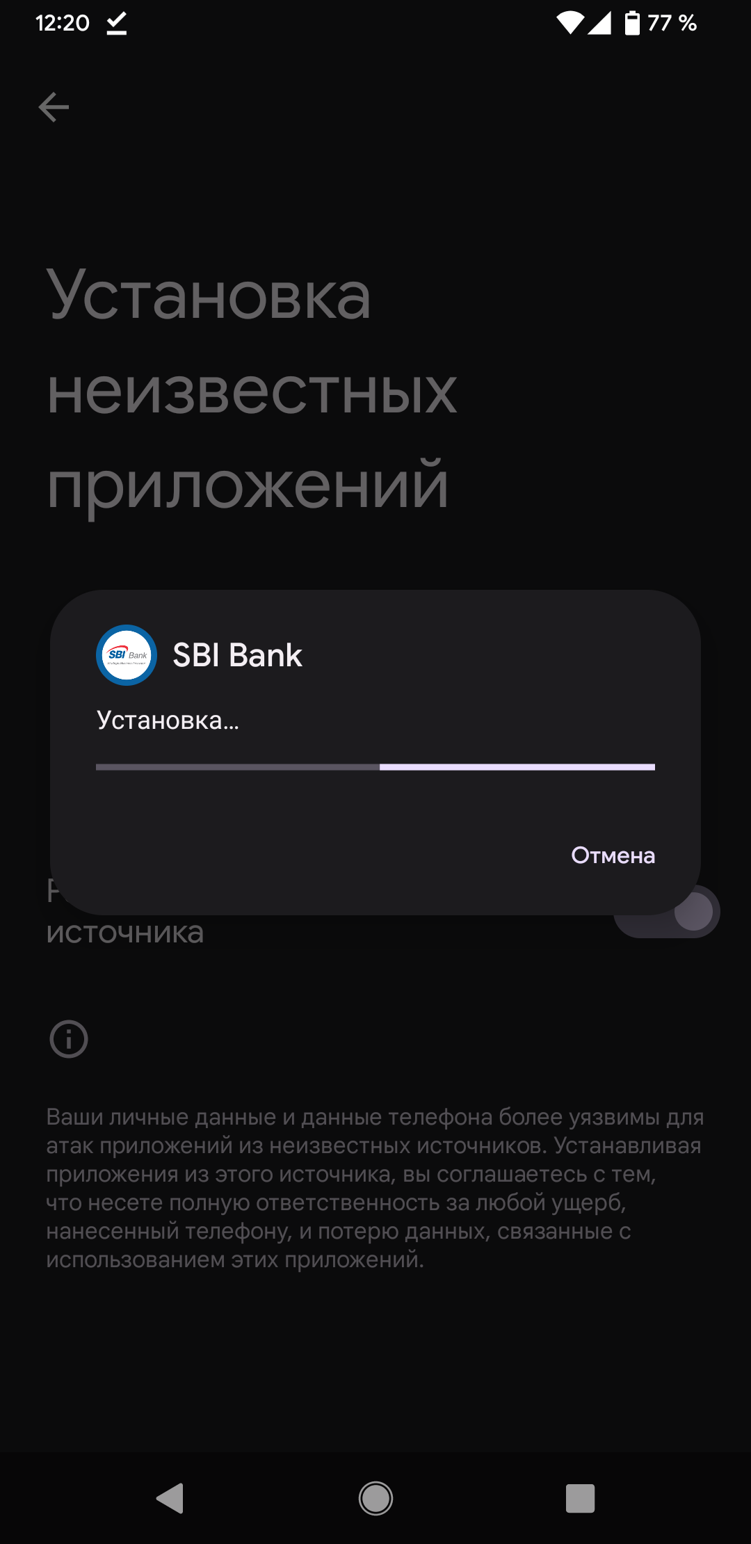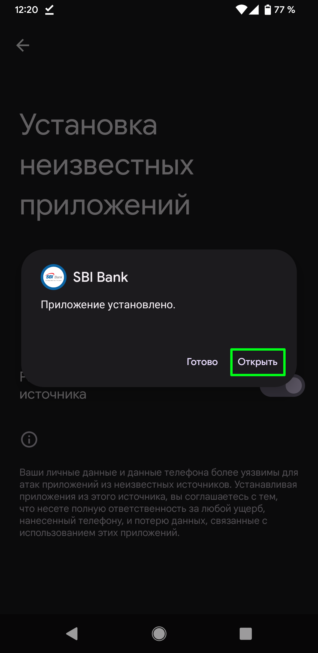 Для установки приложения SBI Bank LightApp из установочного файла формата АРК, размещенного на сайте Банка в сети Интернет, сначала необходимо включить разрешение на установку из неизвестных источников в настройках безопасности вашего устройства. В целях обеспечения безопасности после установки приложения рекомендуем отключить установку приложений из неизвестных источников в настройках телефона.